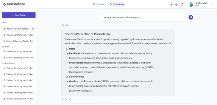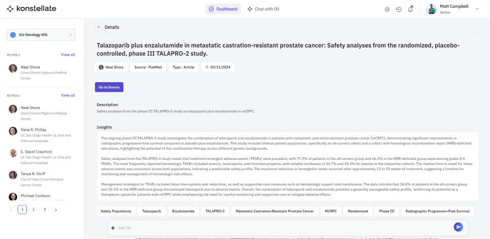 Medical Affairs teams can rely on Konstellate’s OLI to aggregate insights from clinical data, scientific publications, and field interactions.